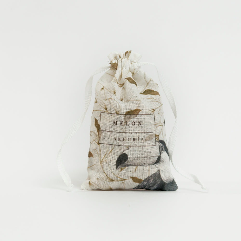 [ Delicada bolsa de fibra natural hecha especialmente para decorar y mantener un agradable aroma de Melón en el carro, cajones, maletas y almohadas. Este aroma compuesto de un aceite esencial de Melón promueve la limpieza energética por su tonalidad acuática y tiene un efecto reanimador por su carácter dulce ]